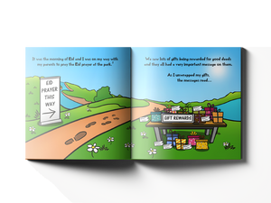 Let your child discover true guidance as they spend Eid at the park receiving gifts for their good deeds. Each gift reads a special note addressing what those deeds are; a fun and engaging way to memorize what Allah says in the Qur’an about righteous deeds and their rewards in just one single verse.