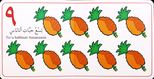 Includes Arabic numbers with corresponding number of pictures with Arabic name and English pronunciation of the illustrated item.