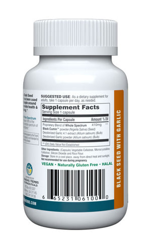 Whole Spectrum Black Seed with High Potency Garlic contains 100% Pure Black Cumin Seed whole-herb and High Potency Garlic extract. Promotes general health and well-being. An excellent supplement for cardiovascular, respiratory and immune system support.